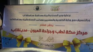 دشّنت مؤسسة البصر العالمية (مستشفى مكة لطب وجراحة العيون بجبلة) فرعها الثاني في مدينة إب بافتتاح “مركز مكة التخصصي لطب وجراحة العيون” يوم الاثنين الموافق 2 فبراير 2026 ، في خطوة تهدف إلى توسيع نطاق خدماتها المتخصصة في مجال طب وجراحة العيون والوصول إلى شرائح أوسع من المرضى في المحافظة وما جاورها.